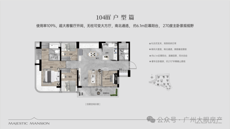 【100㎡四房两厅两卫】:西南向,使用率109%,南北通透,约6.1米巨幕阳台,主卧270°主卧弧形玻璃幕窗。