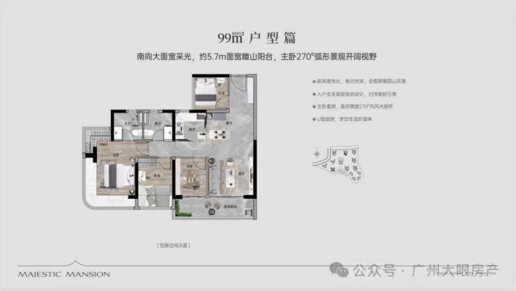 【96㎡四房两厅两卫】:西南向,使用率100%,约5.7米面宽瞰山阳台,主卧270°主卧弧形玻璃幕窗。