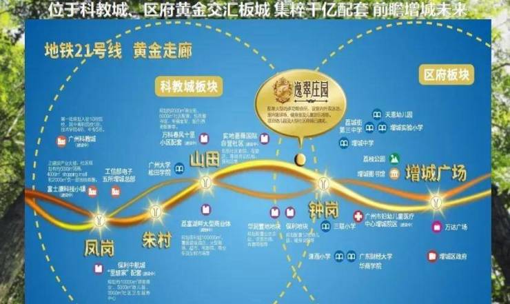 立体交通网持续完善,距离逸翠庄园仅约2公里的北三环出口可接驳到增天高速,建成后,从逸翠庄园出发可直达天河,相比之前路程缩短近30公里,大大提升通行效率(规划中) 毗邻地铁21号线钟岗站和山田站,快线4站即可到达天河。