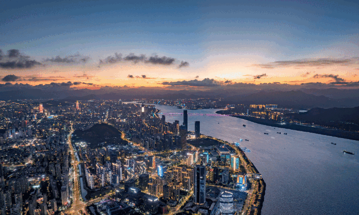建筑层间线条与山墙选用象牙白色铝板,仅2公分的香槟金线条收边,硬朗中透着精致;塔冠经特殊内收造型处理,高低错落间形成斜向船帆的视觉形象,恰似温州 “千年商港,百帆竞发”的恢弘气势,让现代建筑与城市精神隔空对话。MAJESTI