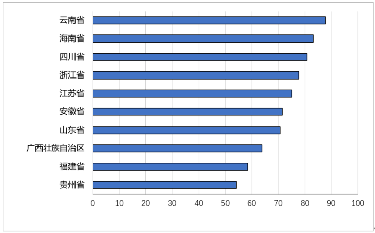 依据康养旅游影响力评价体系,对各省的康养旅游产业从竞争力、品牌力到传播力进行综合评价的结果,排在的前10位的分别是:云南省、海南省、四川省、浙江省、江苏省、安徽省、山东省、广西壮族自治区、福建省、贵州省。