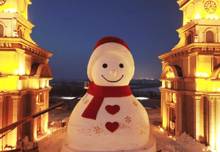 1月4日,在哈尔滨松花江畔,工人进行大雪人收尾工作(无人机照片)。新华社记者 王建威 摄