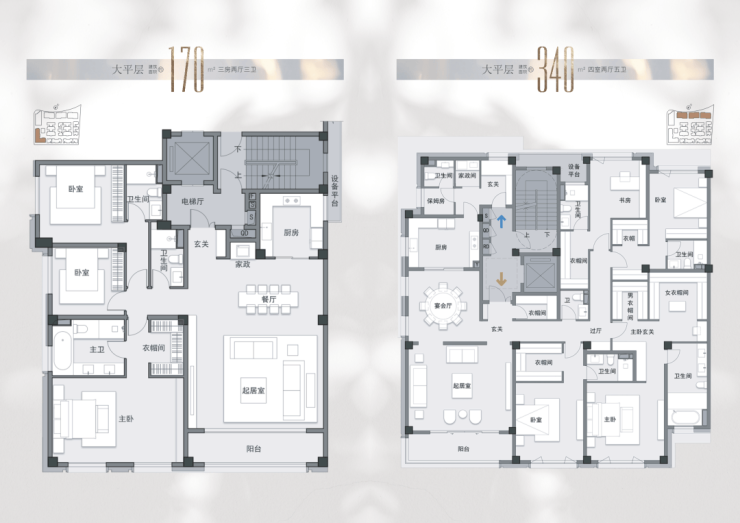 1号楼为保障房,2、3、4、8#为洋房平层,5、6、7、9、10#为别墅。洋房建面约170-340㎡,别墅建面约430-690㎡。