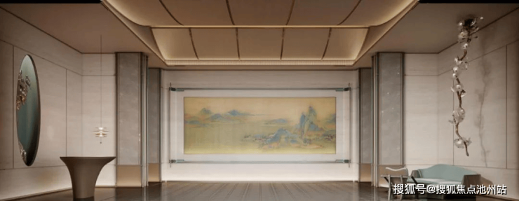 穿过巍峨大门,约5.4米挑高的门厅内,一幅以珐琅非遗工艺打造的《千里江山图》迎客画赫然入目。