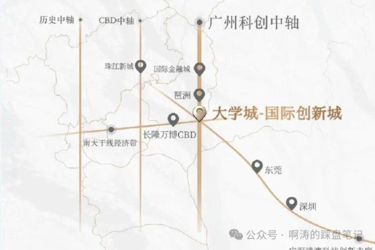 项目位于大学城二期-国际创新城板块,国际创新城共十平方公里,有暨南大学和广州医学院,整个创新城包括北翼的生物岛,核心的大学城和南翼的南岸起步区,南村地区,化龙地区,国际展贸城,在空间结构上形成了一核两翼。