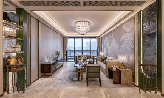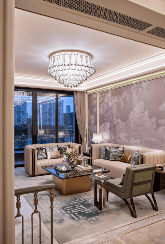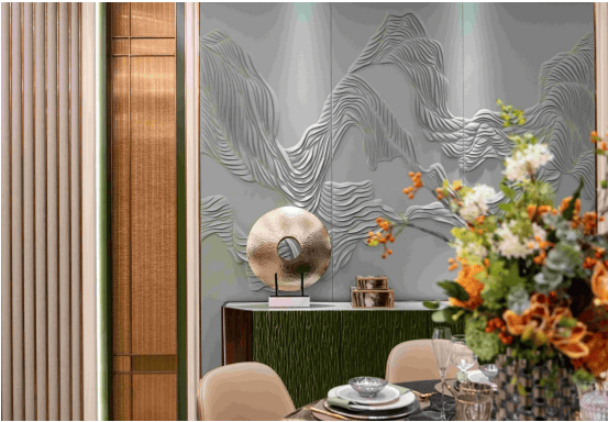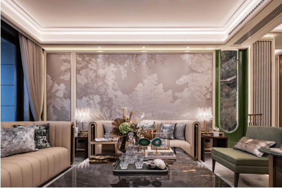 客厅背景墙为阿玛尼底材刺绣墙艺,营造清雅美学。