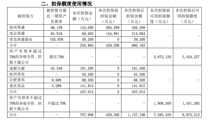 焦点财经快讯 1月28日,荣盛发展发布公告称,拟为成都天赫、杭州荣玺、合肥荣邦、徐州荣盛、重庆荣品、南京荣盛、青岛荣盛嘉业7家下属公司提供45.7亿担保。 截至本公告披露日,荣盛发现实际担保总额为 640.22 亿元,占其最近一期经审计净资产的 156.58%。