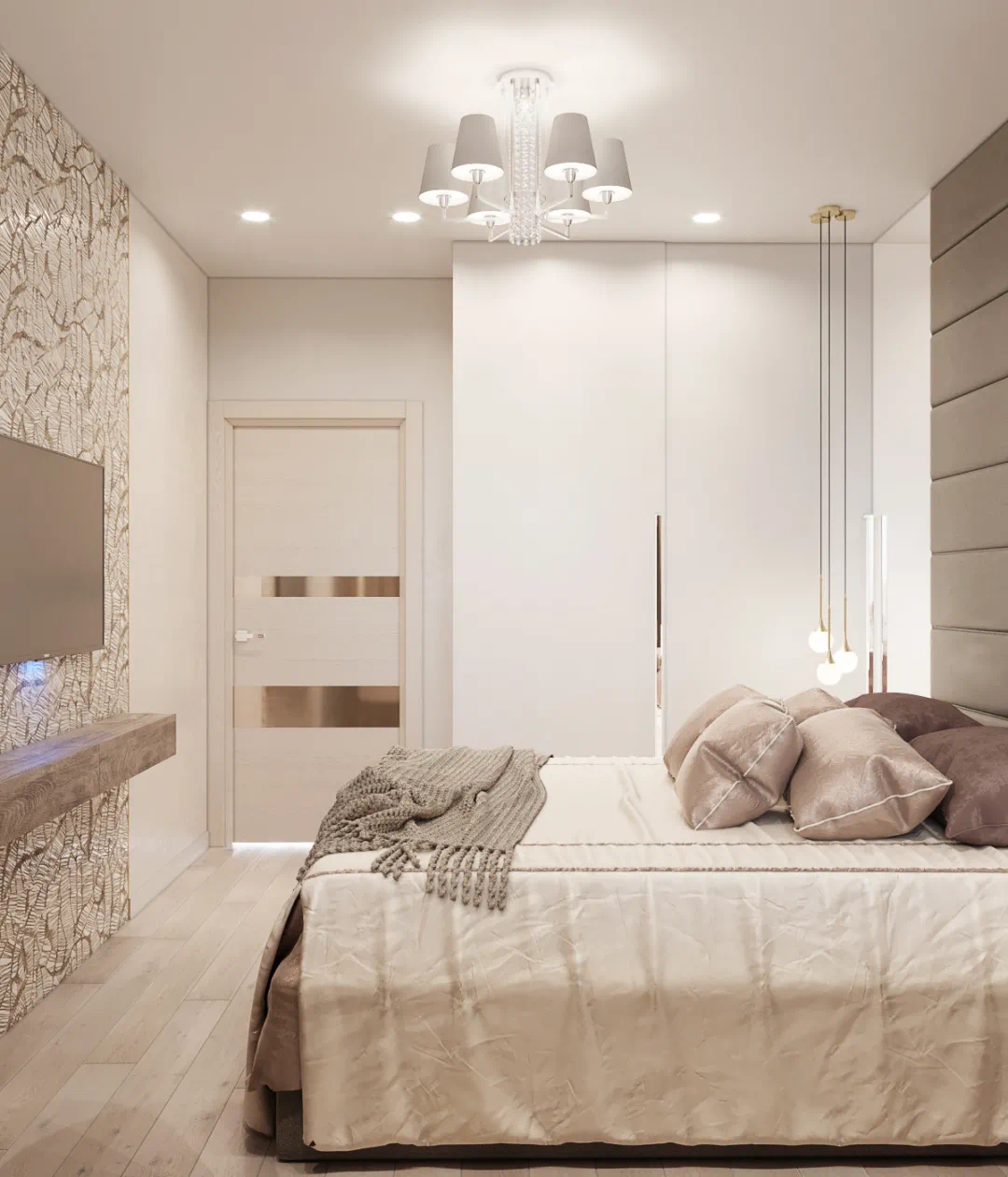 41㎡的米色一室公寓,设计师将少有的房间布置成舒适的卧室,配有一张大床。私人区域配有电视墙、窗前的大桌面、开放式书架、床后的大型天花板、柔软墙板和衣柜。