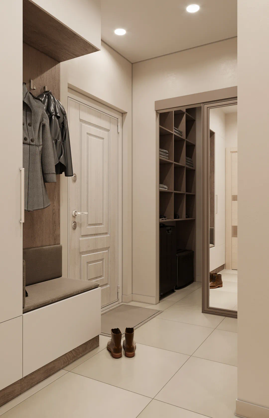 装饰以中性背景为基础,柔和的米色和褐色、灰色与白色相结合,使室内非常温馨和微妙的女性化。材料的使用、色彩、卧室墙纸的图案、用餐区墙壁的构图都加强了自然感。
