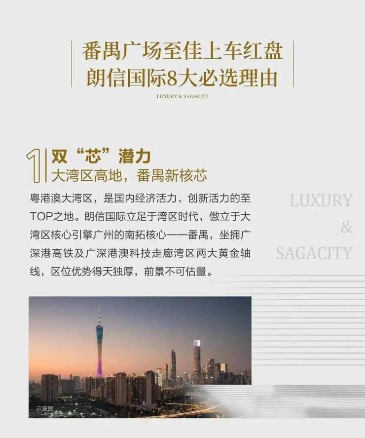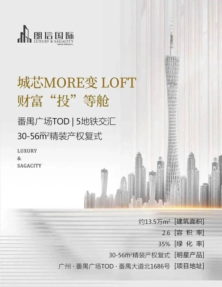朗信国际位于广州市番禺区,由广州市聚英发展有限公司开发。该项目紧邻番禺广场TOD,处于番禺大道北,是城市发展中轴线的关键节点。朗信国际的整体定位为“复合型水岸精英特区”,产品涵盖商办公寓、商墅、商业等,并拥有稀缺的水岸景观。项目的建筑面积约为135,000平方米,占地面积约为43,573.8平方米,绿化率为35%,容积率为2.6。物业管理由广州市聚英物业管理有限公司负责。朗信国际的产权年限为40年,提供带装修的住宅单位。