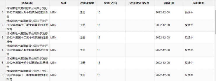 焦点财经讯 耿宸斐 12月8日,交易商协会网站披露绿城房地产集团有限公司关于发行2022年度第八、九、十、十一、十二、十三期中期票据的注册报告,合计90亿元,项目状态为“预评中”或“反馈中”。
