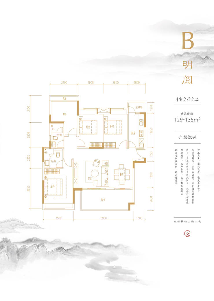【B户型】建筑面积约129-135平米,4室2厅2卫