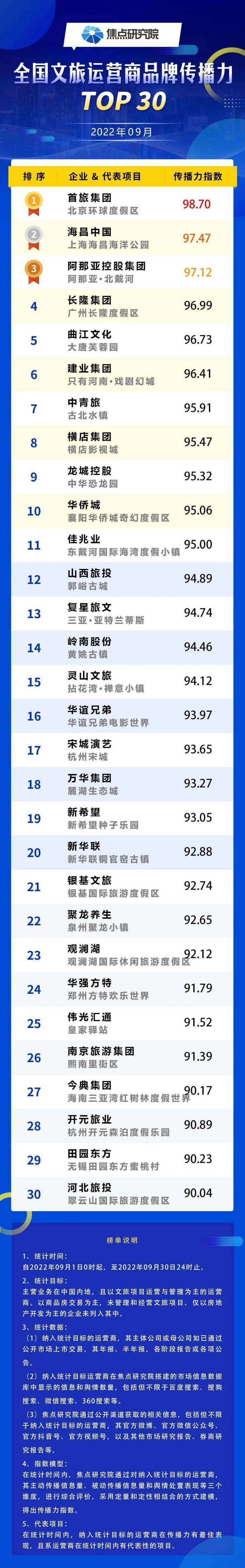 2022年9月,文旅运营商品牌传播力TOP 30榜单中排名前五的运营商依次为首旅集团(98.70)、海昌中国(97.47)、阿那亚控股(97.12)、长隆集团(96.99)和曲江文化(96.73)。