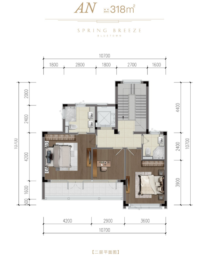 二层是三个房间,足够开阔实用;更赞的是主卧还设置了双台盆;顶部还做了坡屋顶,更有空间感,较高处层高可以达到约3.6米。