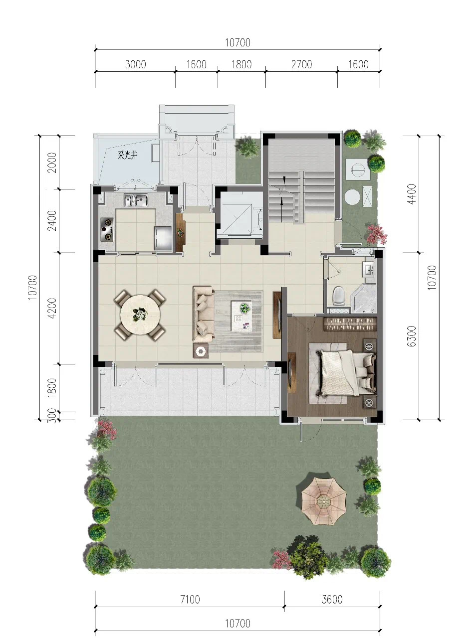 做到了三开间朝南;一楼层高达到近4米,客厅面宽拉到约7.1米,一楼老人房开间也达到约3.6米,推门就能闲看中庭栀子花。