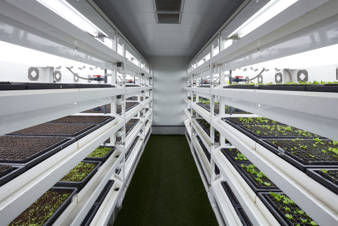 科技与农业的碰撞在这里激出了绚丽的火花。约1600㎡的三菱植物工厂,分布着各种无土水培的现代化种植大棚。