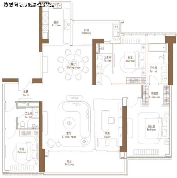230方四房两厅三卫,南北双景双阳台,开放式江景书房,奢阔主卧套房!