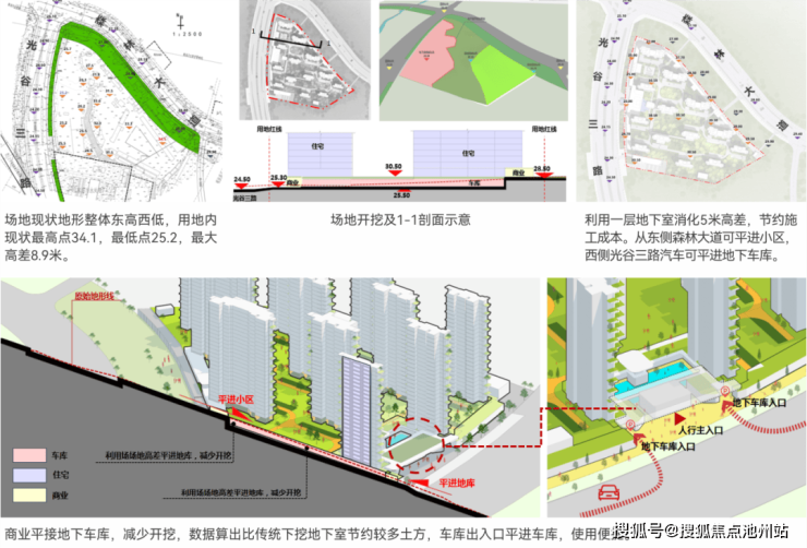 竖向空间界面充分考虑场地内及四周道路之间的高差特点,采用了半地下室的“台地设计策略”。在西侧商业区域与东侧地库之间形成自然的高度衔接,有效减少了土方开挖量,降低工程难度和成本的同时,也使建筑与场地环境更加和谐融洽。车库的设计通过平坡形式平进地库,提高了安全性和使用的舒适度,实现了功能与经济的双重平衡,增强了住区环境的空间层次感,为居民提供更优质的生活体验。