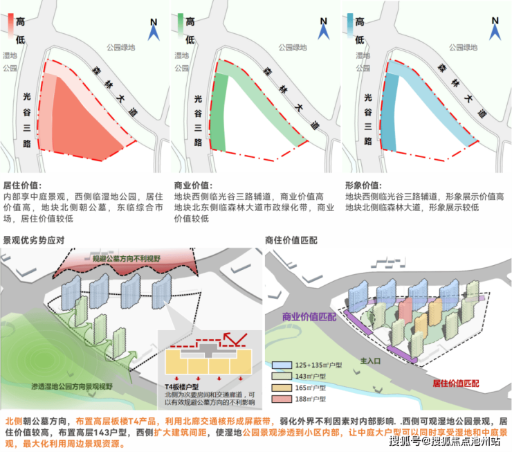 设计通过对用地与周边区位、交通和空间尺度等要素分析,充分挖掘场地价值,综合平衡居住、商业和形象三方面的潜力,同时通过合理的户型设计,有效规避北向陵园的不利影响,创造优质的人居生活体验。