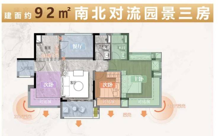 92㎡三房两厅两卫:南北通透,全明格局,户型方正