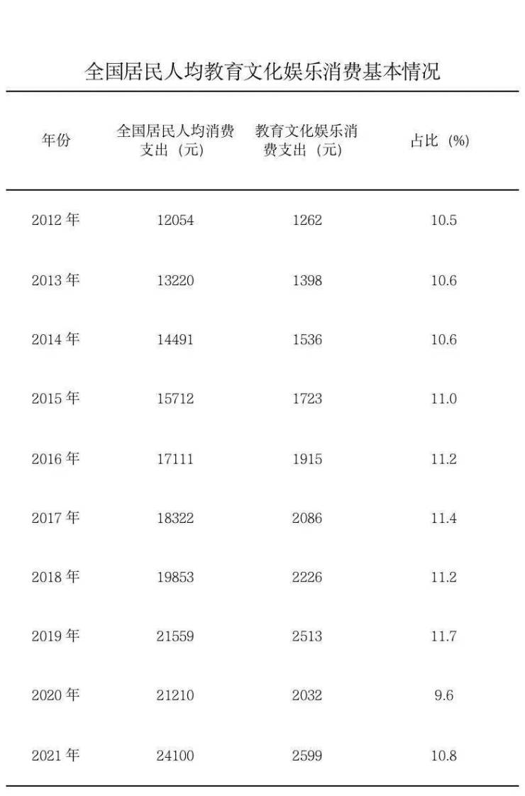 中新网10月14日电 据文化和旅游部官方微信公众号消息,2021年全国居民人均教育文化娱乐消费支出2599元,较2012年增长105.9%,占人均消费支出比重10.8%。文旅部表示,十年来,文化产品和服务供给不断丰富,促进文化和旅游消费取得显著成效。(完)