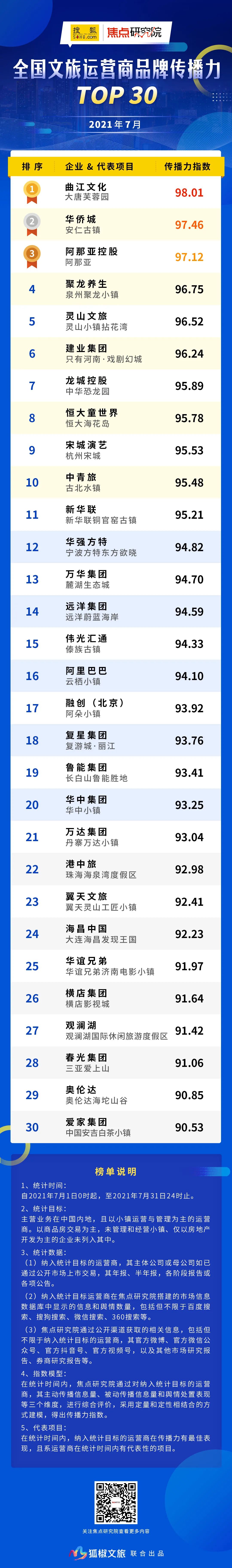 权威发布 | 7月全国文旅运营商品牌传播力TO30