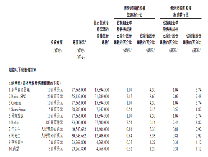 当中,10名基石投资者共认购1.59亿股,包括新华资产管理、嘉信金融集团旗下Kaiser SPC基金、金蝶国际软件集团旗下投资平台Crotona、商汤科技旗下投资平台SensePower、昇辉控股、深圳凯尔汉湘实业的投资管理公司Keltic、自然人江淦钧及柯建生、华科资本和尚慧企业。
