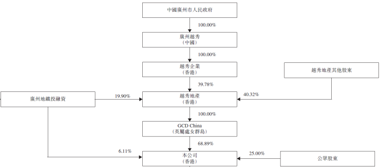全球发售完成后,越秀服务较新股权架构为:越秀地产通过GCD China持股68.89%,广州地铁通过广州地铁投资融持股6.11%,包括基石投资者在内的公众股东持股25%。
