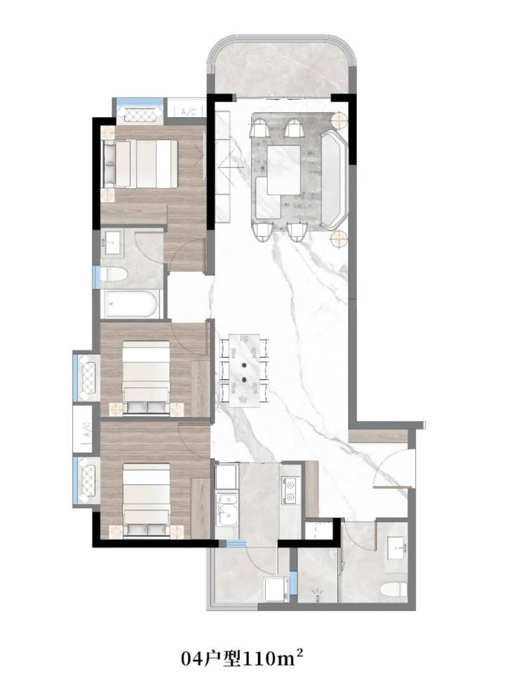 04户型:约110㎡,三房两厅两卫带主套