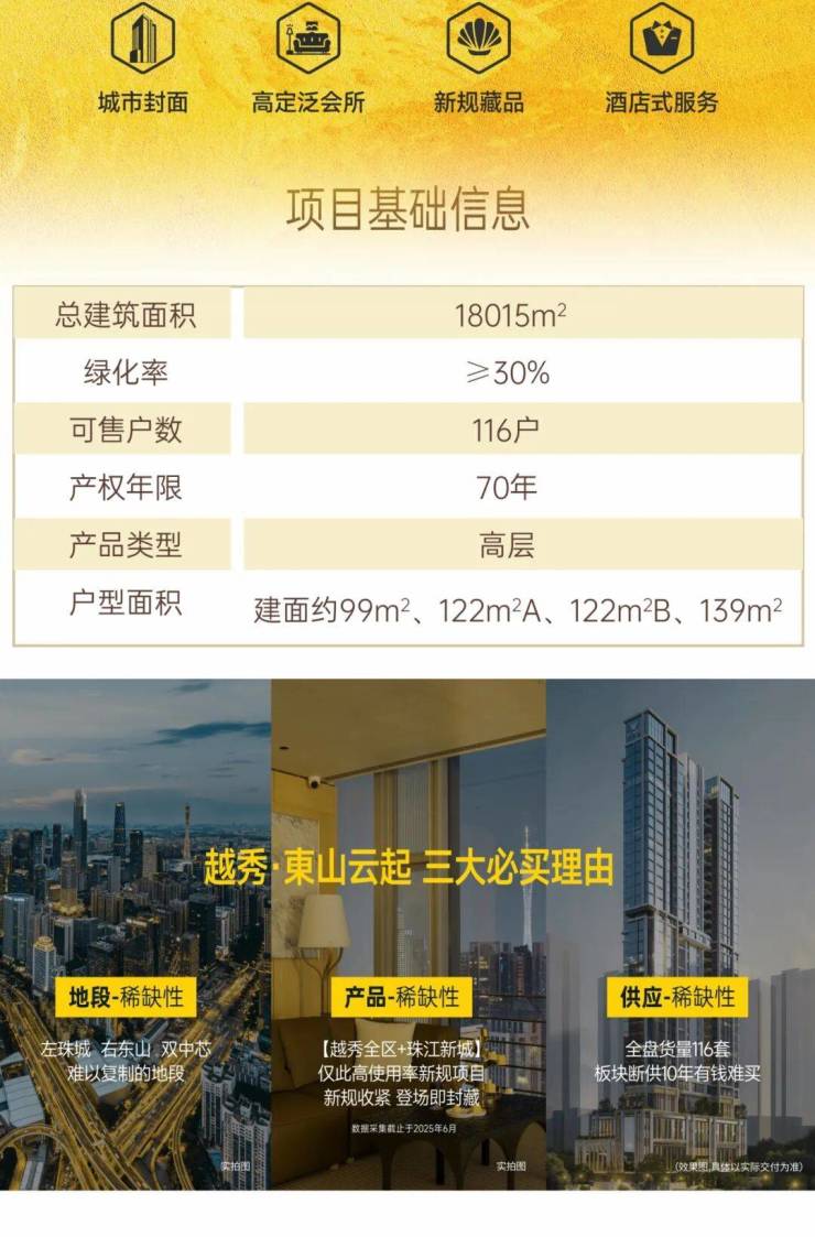 越秀·#东山云起(核准名东启轩),落子广州老东山与珠城CBD双核交汇处,是越秀打造的主城绝版全新规先锋系住宅,全盘仅116席,建面约99-139㎡高奢户型,坐拥白云山、珠江双景观