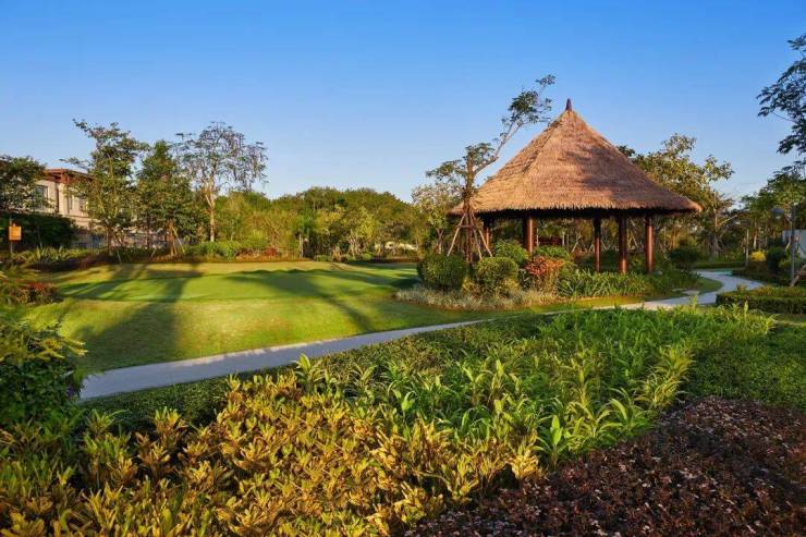 在东南亚风情园林中,融入椰子树、霸王棕、银海枣、火山石等海南当地特色自然元素,让海南的火山群地貌与热带雨林生态,真正地走进日常生活环境中。