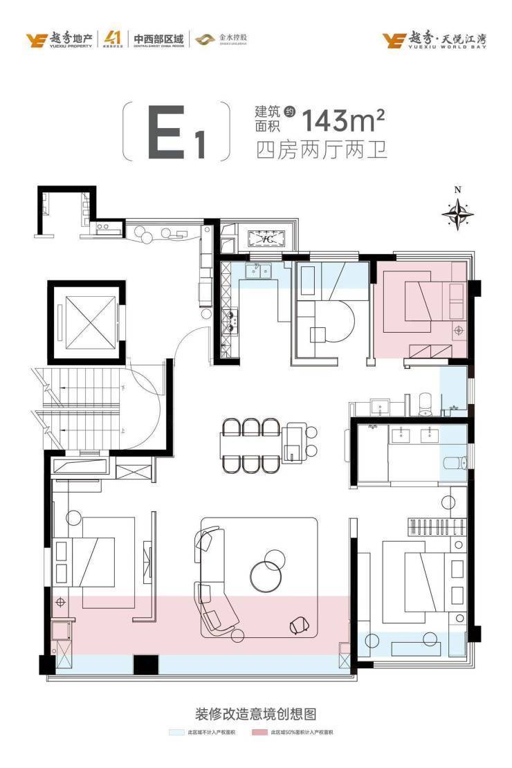 1、片区首个综合得房率约100%户型,143㎡空间享市面180㎡空间体验。