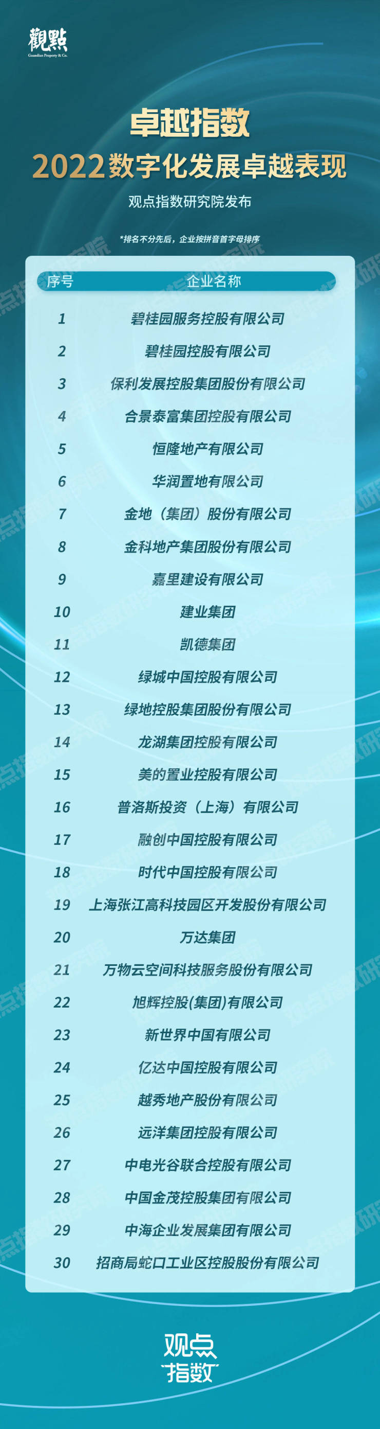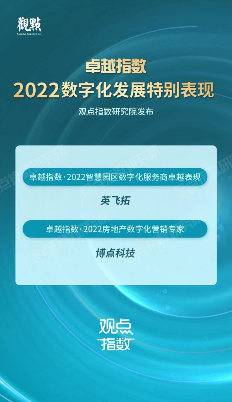 最终根据企业以上综合表现,产生“先进指数·2022数字化发展先进表现”、“先进指数·2022智慧园区数字化服务商先进表现”以及“先进指数·2022房地产数字化营销专家”等研究成果。并于5月18日“2022观点数字化未来发展大会”上发布,与行业共同见证数字化表现突出企业的风采。