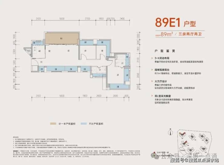 89㎡的3房2厅2卫,E1户型,设计的是横厅南北通透格局,进门入户玄关,客餐厅5.6米开间,LDKB一体化设计,客餐厅出11㎡的大阳台,主卧+1个次卧双飘窗设计,全屋12面飘窗,分别做到了主卧15.1㎡/次卧7.83㎡/次卧6.96㎡(包含墙体飘窗),L型灵动式厨房,卫生间干湿分离,得房率约:77.39%(不含赠送),阳台主朝西北向。也是可以改4房的格局,赠送面积24㎡,加上赠送得房率104.44%。