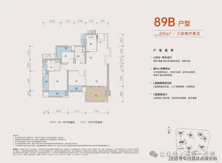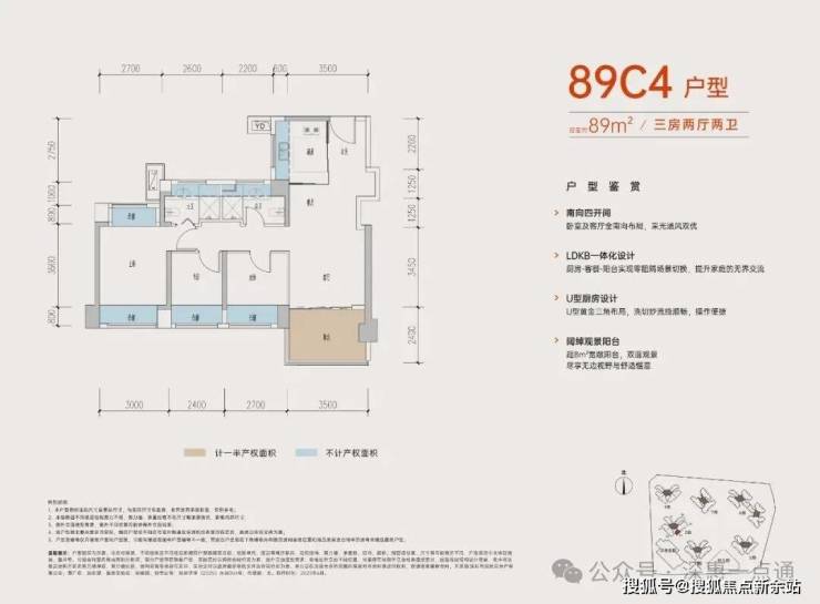 89㎡的3房2厅2卫,B户型,设计的是经典竖厅格局,进门入户玄关,客厅3.5米开间,LDKB一体化,动静分区,三开间朝南,S墙设计预留冰箱卡槽位,主卧+1个次卧270°飘窗,分别做到了主卧15.1㎡/次卧8.52㎡/次卧7.77㎡(包含墙体飘窗),U型厨房,卫生间干湿分离,得房率约:77.39%(不含赠送),西南朝向。赠送面积16.96㎡,加上赠送得房率96.84%。