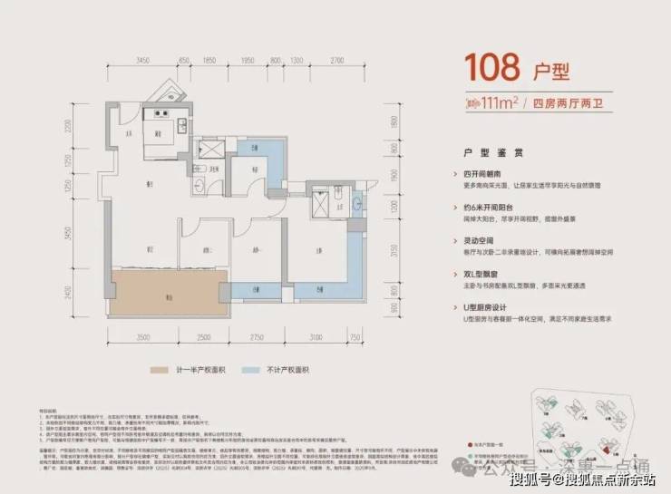 108-110㎡的4房2厅2卫,A户型,设计的是经典竖厅格局,进门入户玄关,客厅3.45米开间,LDKB一体化,S墙设计预留冰箱卡槽位,四开间朝南,动静分区,主卧+1个次卧270度大飘窗,客厅连接次卧出6米长大阳台,分别做到了主卧16.4㎡/次卧11.2㎡/次卧7.84㎡/次卧6.25㎡(包含墙体飘窗),U型厨房,卫生间干湿分离,得房率约:77.3-77.39%(不含赠送),西南朝向。赠送面积18.4㎡,加上赠送得房率94.04%。
