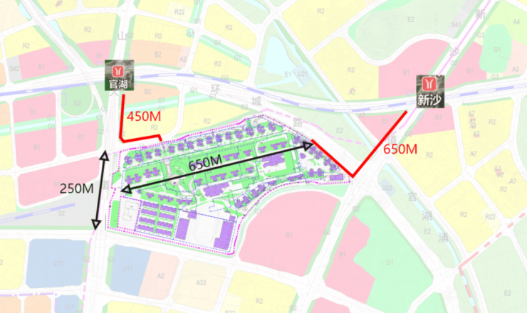 品秀星图很大,横跨了13号线官湖站和新沙站,小区东西两个主入口,到官湖和新沙站的距离分别为450米和650米,步行时间在5到10分钟间。