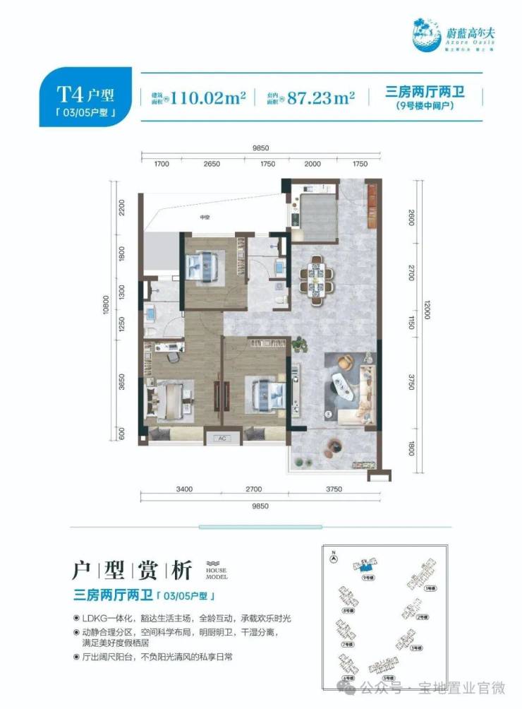 A 户型(1#、9# 楼边户,建面约 104-110㎡三房两厅两卫)
