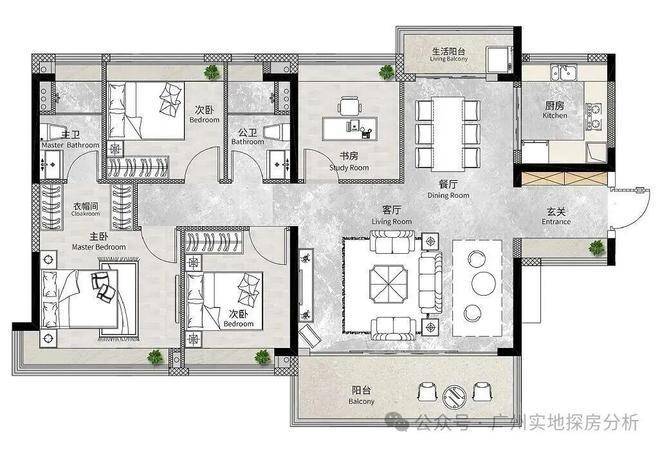 南向户型:主阳台望花都湖及绿轴公园。