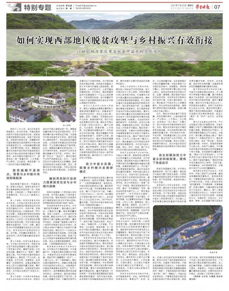 2021年7月,中央党校课题组专程奔赴中益乡,进行“西部地区脱贫攻坚与乡村振兴有效衔接”专题调研。随后,调研成果经由《学习时报》整版刊发。该文章系统分析了融创在探索中国乡村振兴方面的实践经验和模式探索,并指出其意义和推广价值——“融创通过深度调研,找准乡村发展需求,发挥企业自身资源优势,正努力探索和帮助西部乡村走出一条可持续发展之路”。