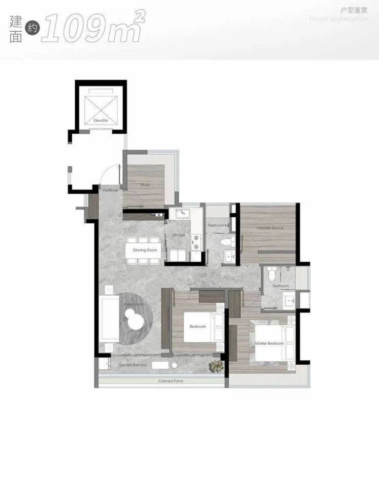 建面约109㎡户型同样独具优势,首推房源南向望一线滨水美景。它有两组亮眼数据:一是使用率超85%,功能与尺度合理交互;二是窗地比高达约48.9%,将南北对流的优势发挥极致。这样的房子,在夏天可以少开很多空调,在家中就能吹到清爽的对流风。建面约126㎡四开间朝南+南北对流只是标配,
