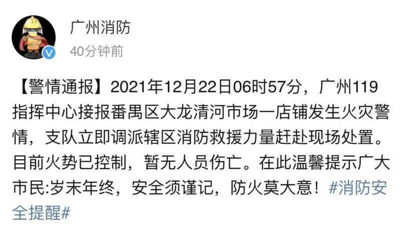 根据广东省广州市消防支队通报,广州119指挥中心在12月22日6时57分接报番禺区大龙清河市场一店铺发生火灾警情,支队立即调派辖区消防救援力量赶赴现场处置。