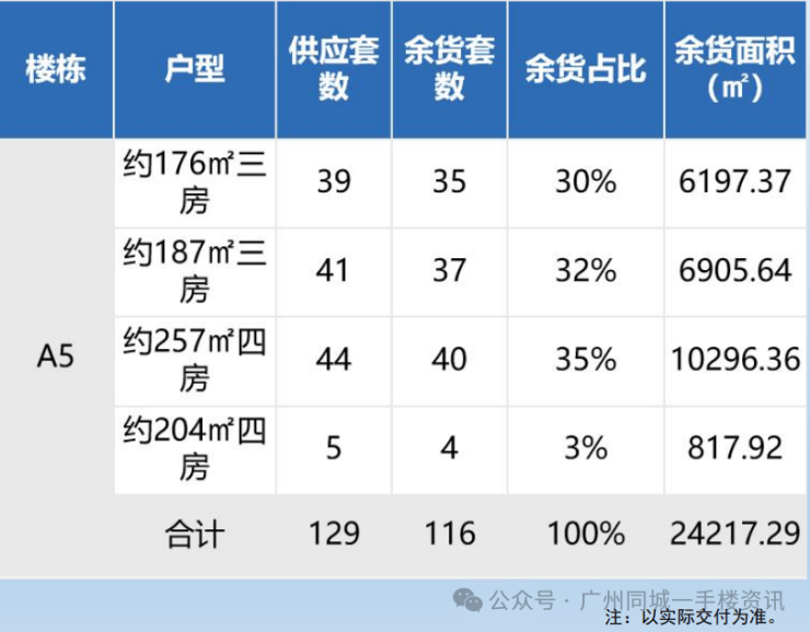 A5栋目前已完成建设及各项验收,并办理权属证明,现房出售。可售余货共116套,总面积约2.4万㎡,另有412个车位。户型灵活多样,满足各种需求;3梯3户,出入便利。