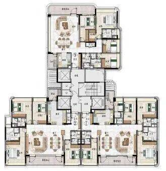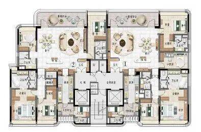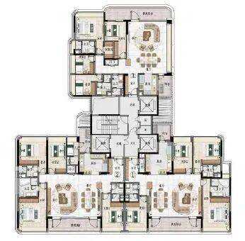 整个小区都是板楼设计,其中1栋和2栋都是2梯2户的大平层,而3栋和4栋则是3梯3户的大平层。由于公共空间的巧妙设计,每户都可以达到独梯独户的效果,从而提高了居民的隐私性。