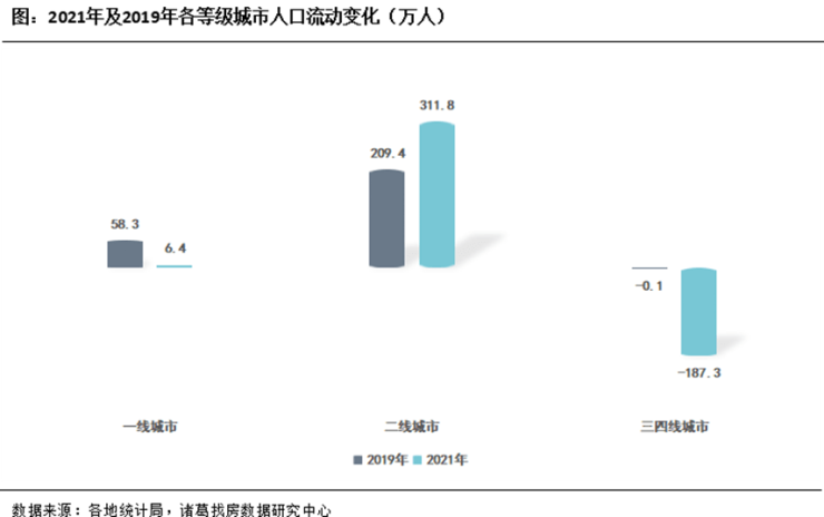在新冠疫情的影响下,生存压力巨大的一线城市不再是年轻人们争相追逐的对象,甚至大批打工人开始逃离一线城市,与此同时,二线城市人口加速流入。根据数据显示,2021年一线城市流入6.4万人,二线城市流入311万人,三四线城市流出187.3万人。较2019年时相比,一线城市少流入50多万人,二线城市流入规模增加100多万,三四线城市加速流出。就在短短的一两年间,人口流动发生重大转向,一线城市不再是“香饽饽”,一些基本面良好并且具备很多潜在机会的二线城市更受人们的青睐,这其中引起如此重大变化的一个重要诱因就是疫情,在疫情影响下,人们工作生活等方方面面都受到不可避免的影响,失业率抬升,收入预期受到影响,这时候一线城市的高房价高消费开始成为人们生存的绊脚石,而此时,一部分二线城市正在迅速崛起,大量的新兴产业逐步引进,教育医疗体系的不断完善,都给二线城市镀上一层金,并且在房价消费等方面的压力又小于一线城市,于是这些城市就成为年轻一代们的最优选择。但是,三四线城市的弊端也在加速暴露,缺乏产业和生活配套,生存条件差,在疫情的激化下更加显现出来,人口的加速流失也就不足为奇了。