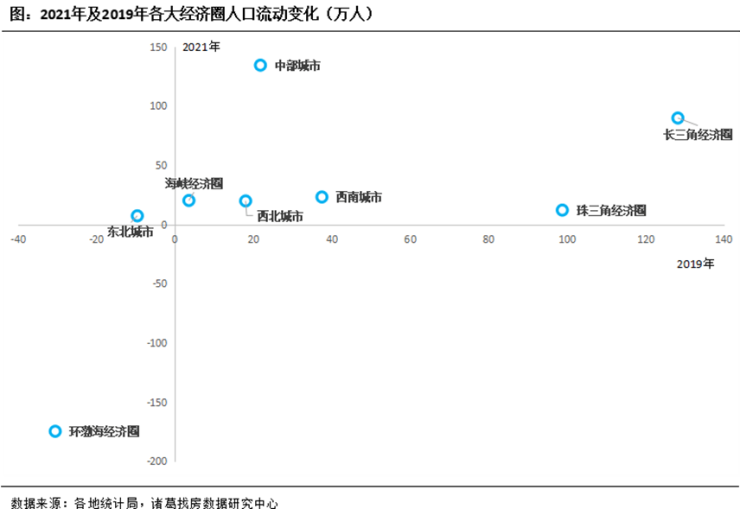 长三角、珠三角两大经济圈人口仍然稳定流入,2021年人口流入规模分别为89.7和12万人,但是较前两年有所放缓,如杭州、宁波、上海等城市,均较2019年人口流入量有所减少。珠三角经济圈的深圳、广州、佛山等城市人口流入规模也均明显缩减,带动整体人口流入量减少了87万人。