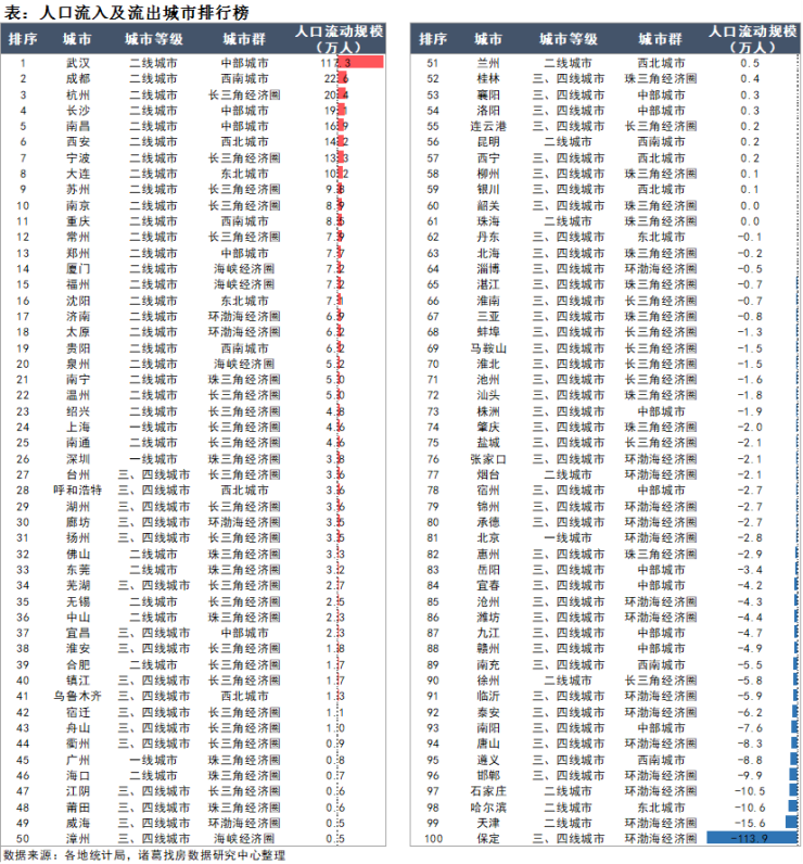 (一)武汉、成都人口流入量名列前茅,保定、天津等环渤海城市人口流失惨重