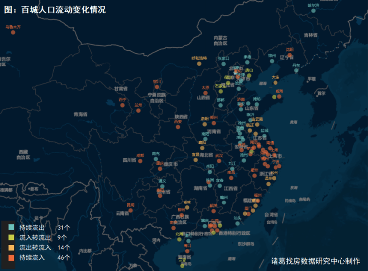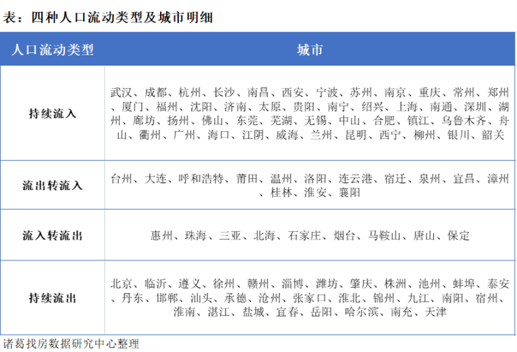 (一)人口持续流入城市多为新一线城市,北京、天津持续流出