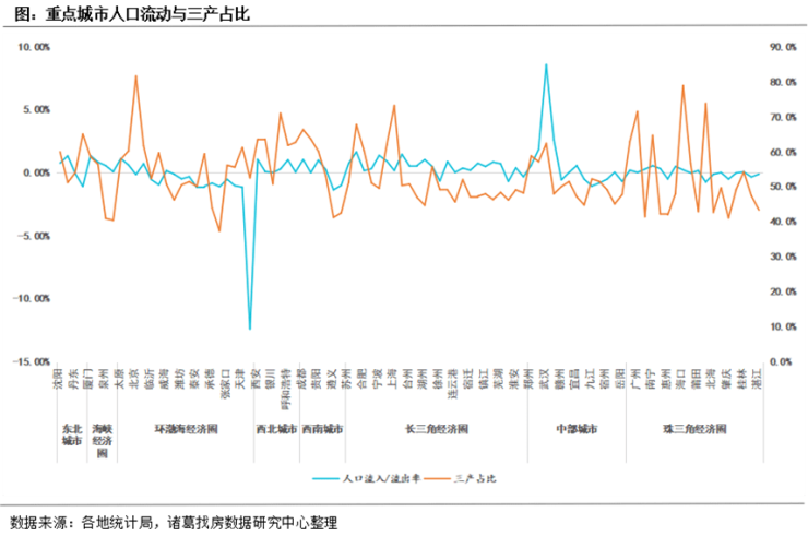 通常说“人随产业走”,大城市具备更好的就业机会和公共服务配套,吸引着五湖四海的人们纷至沓来。根据数据显示,一般情况下,第三产业占比高的城市,人口流入率相对较高,两者之间存在一定的正相关性。如人口流入率高的武汉、杭州、成都、西安、贵阳等城市,第三产业占比也均在60%以上;而人口流出率高的城市,如遵义、唐山、承德、南充、岳阳、马鞍山等城市,三产占比均在50%以下。值得一提的是,北京作为三产占比较高的城市,占比达81.7%,但人口呈现流出现象,流出率为0.13%。