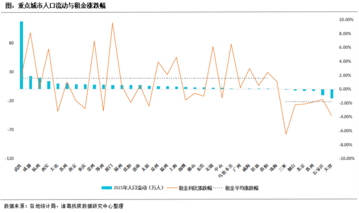 (二)人口流动与房价租金变化呈现一定相关性,流入转流出城市房价跌幅较大